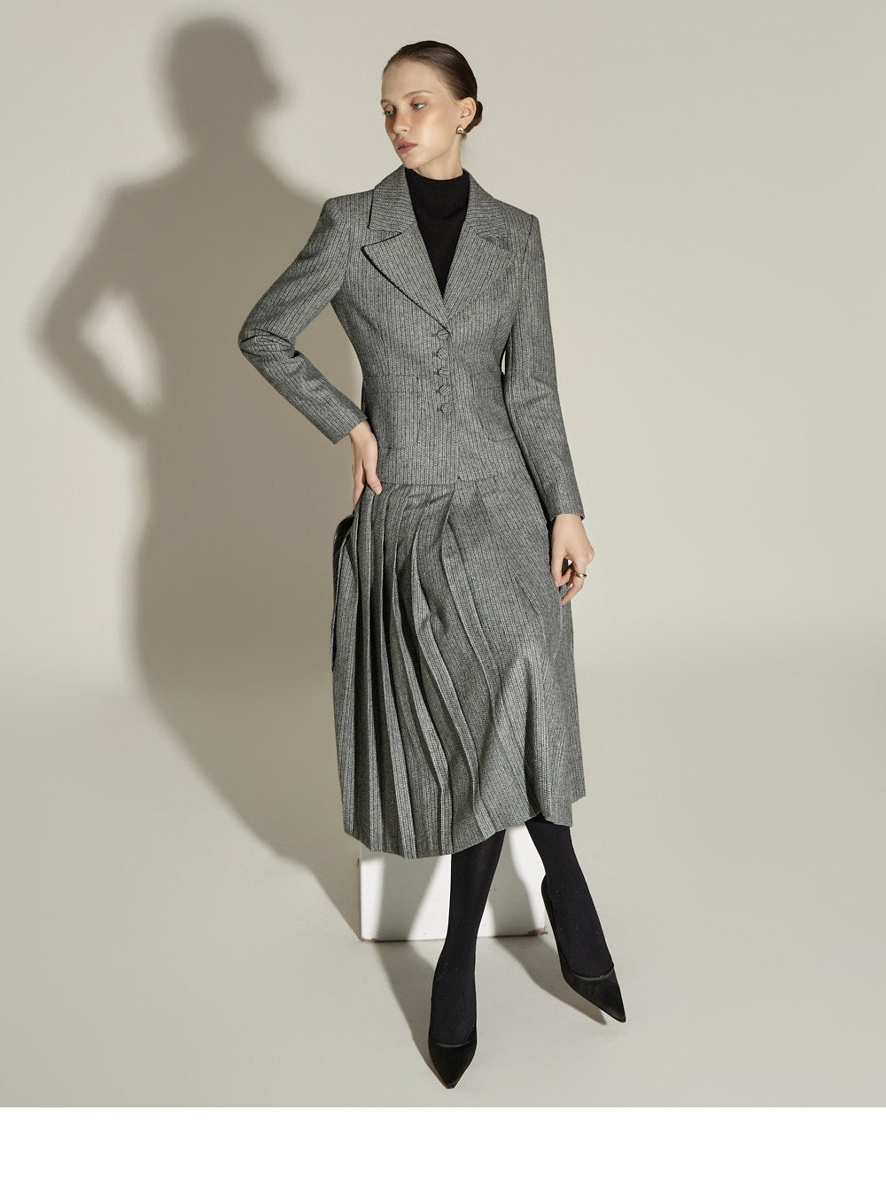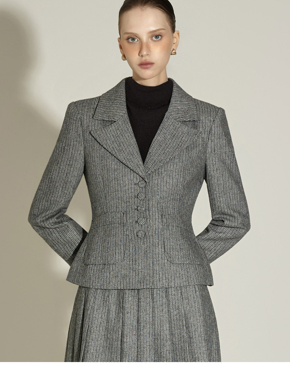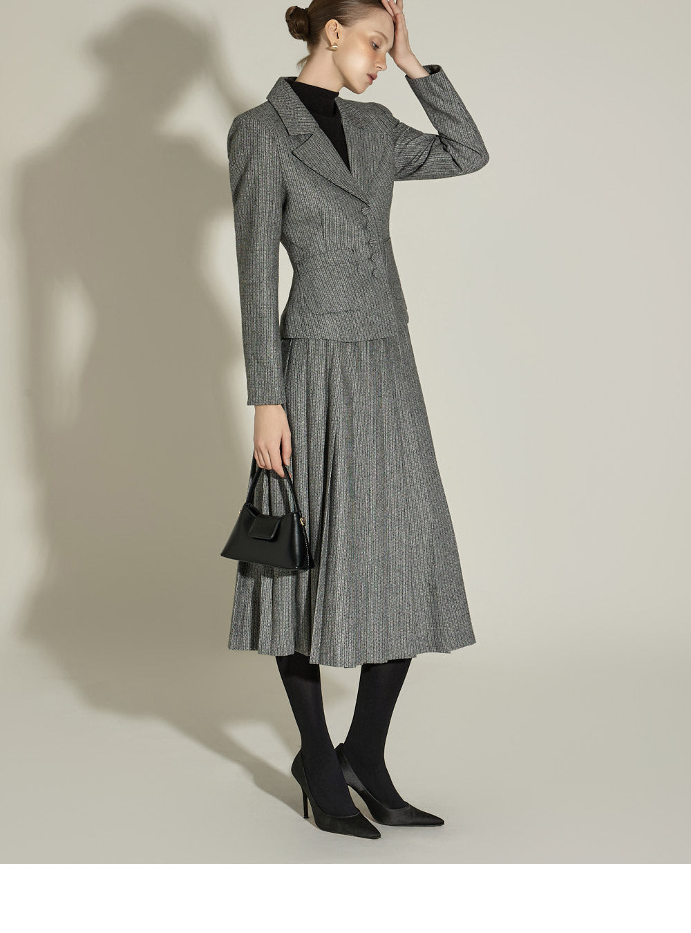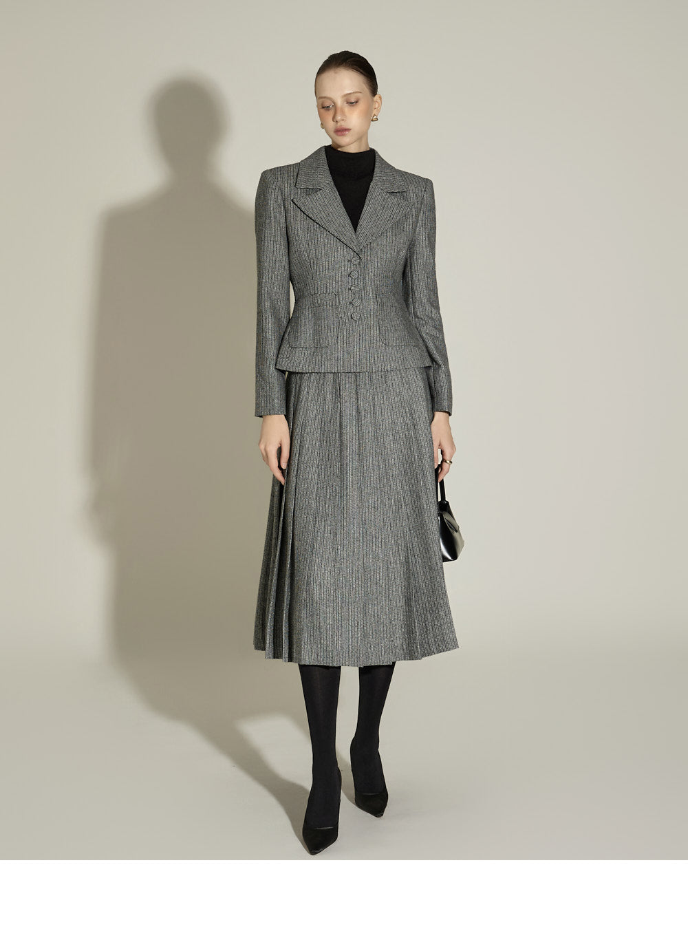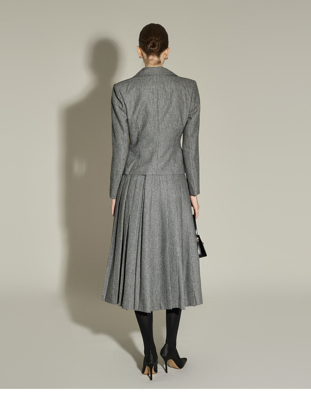 Model (174cm) is wearing a size S jacket and skirt in BLACK.
