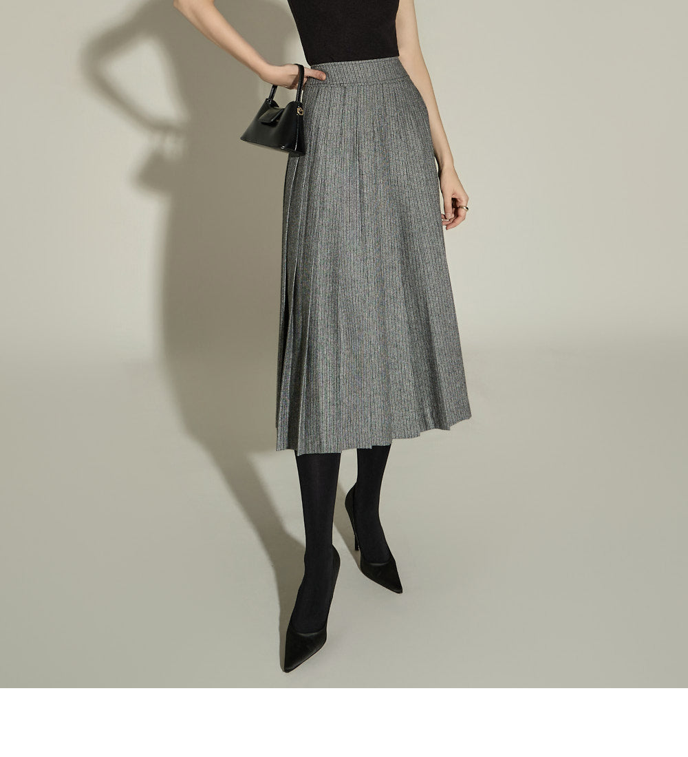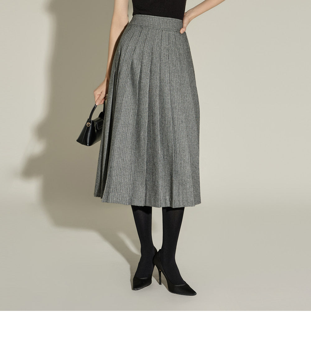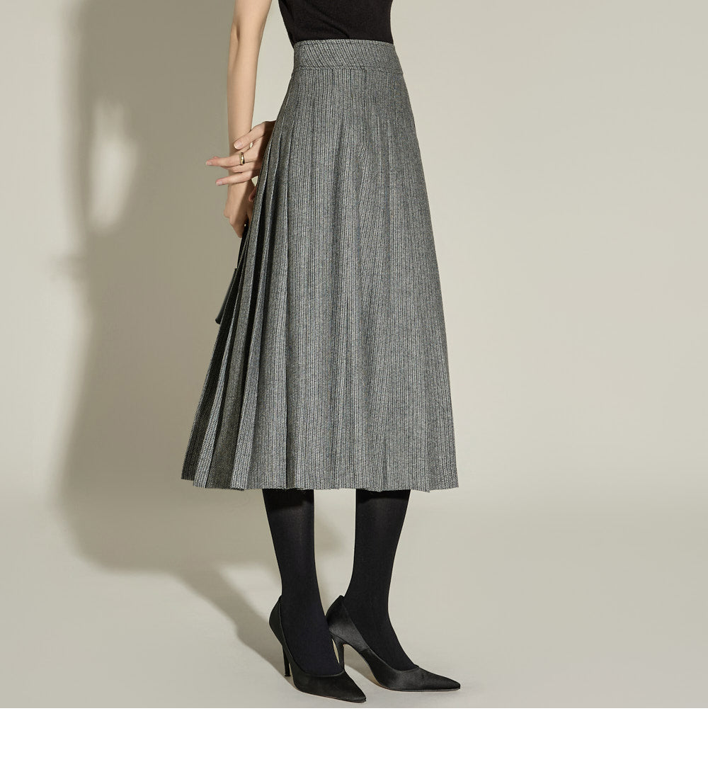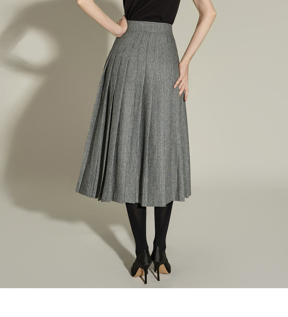 The skirt features a long A-line length and subtle pleats,