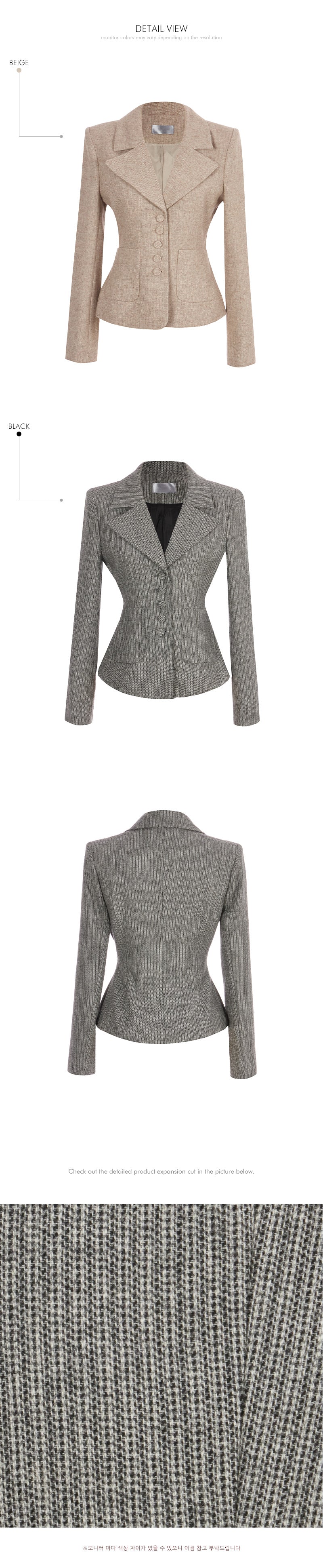 The jacket has a slim fit and short length, creating a clean and refined silhouette.