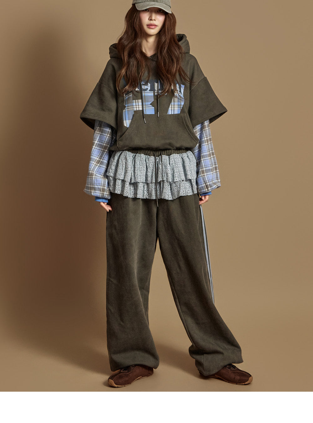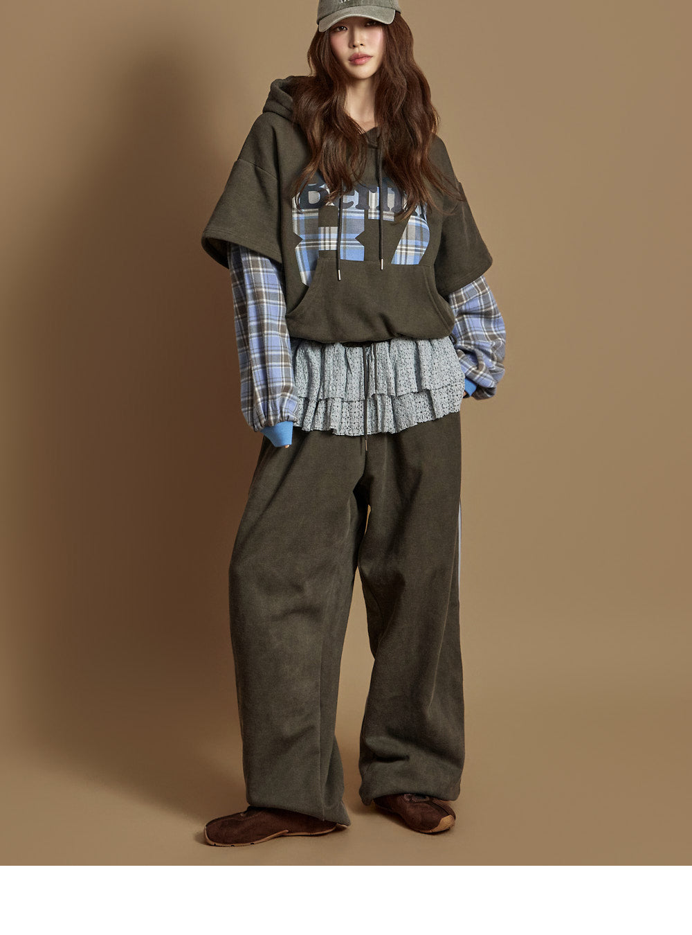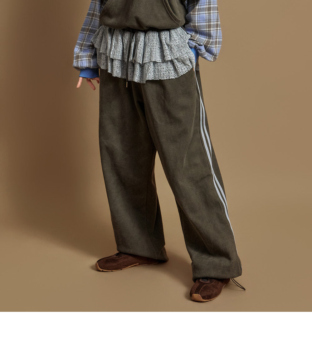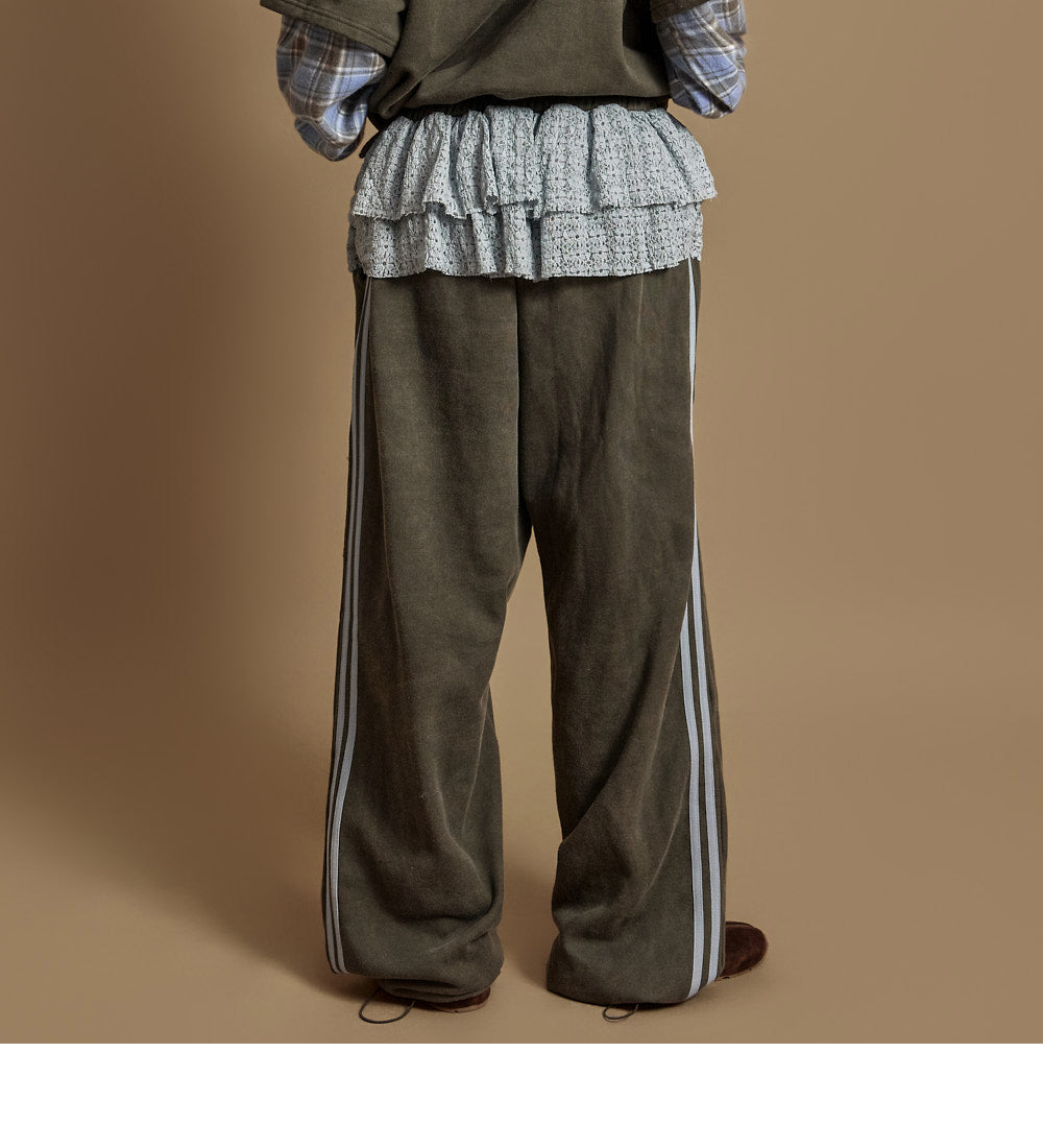 The pants have a wide silhouette, with a comfortable waistband and drawstring,