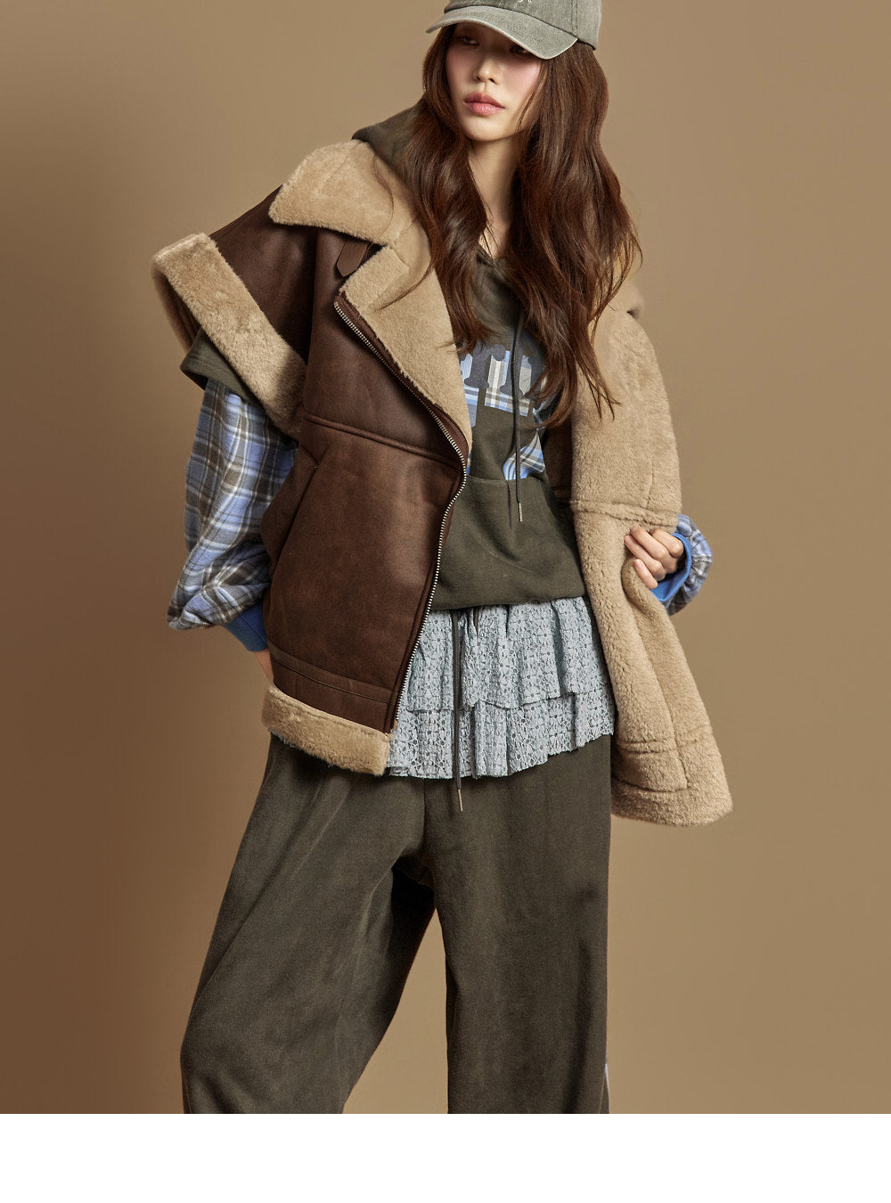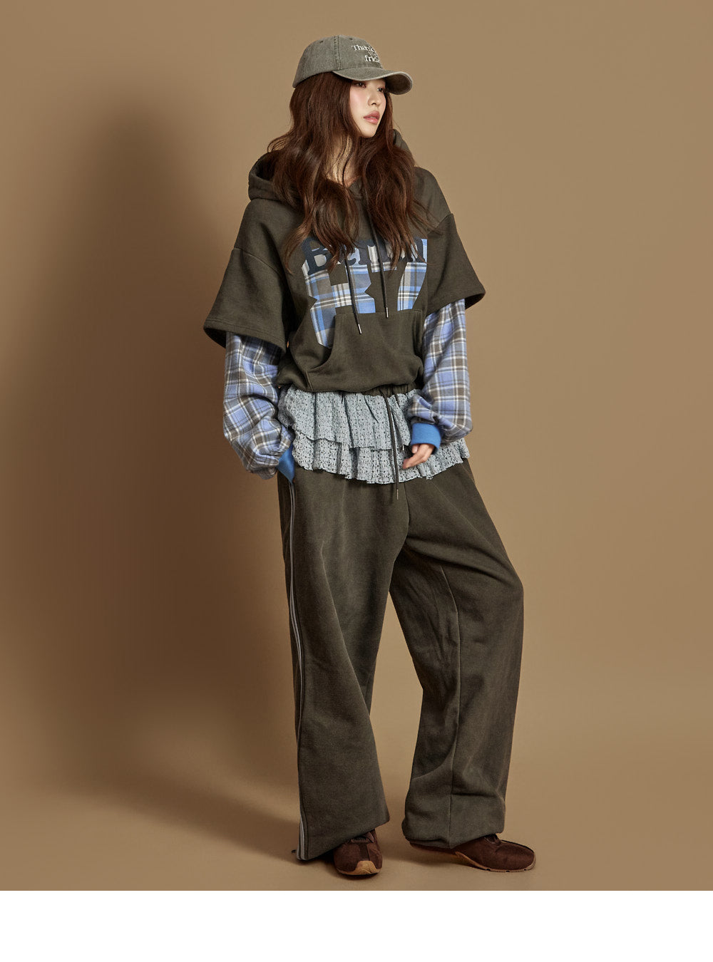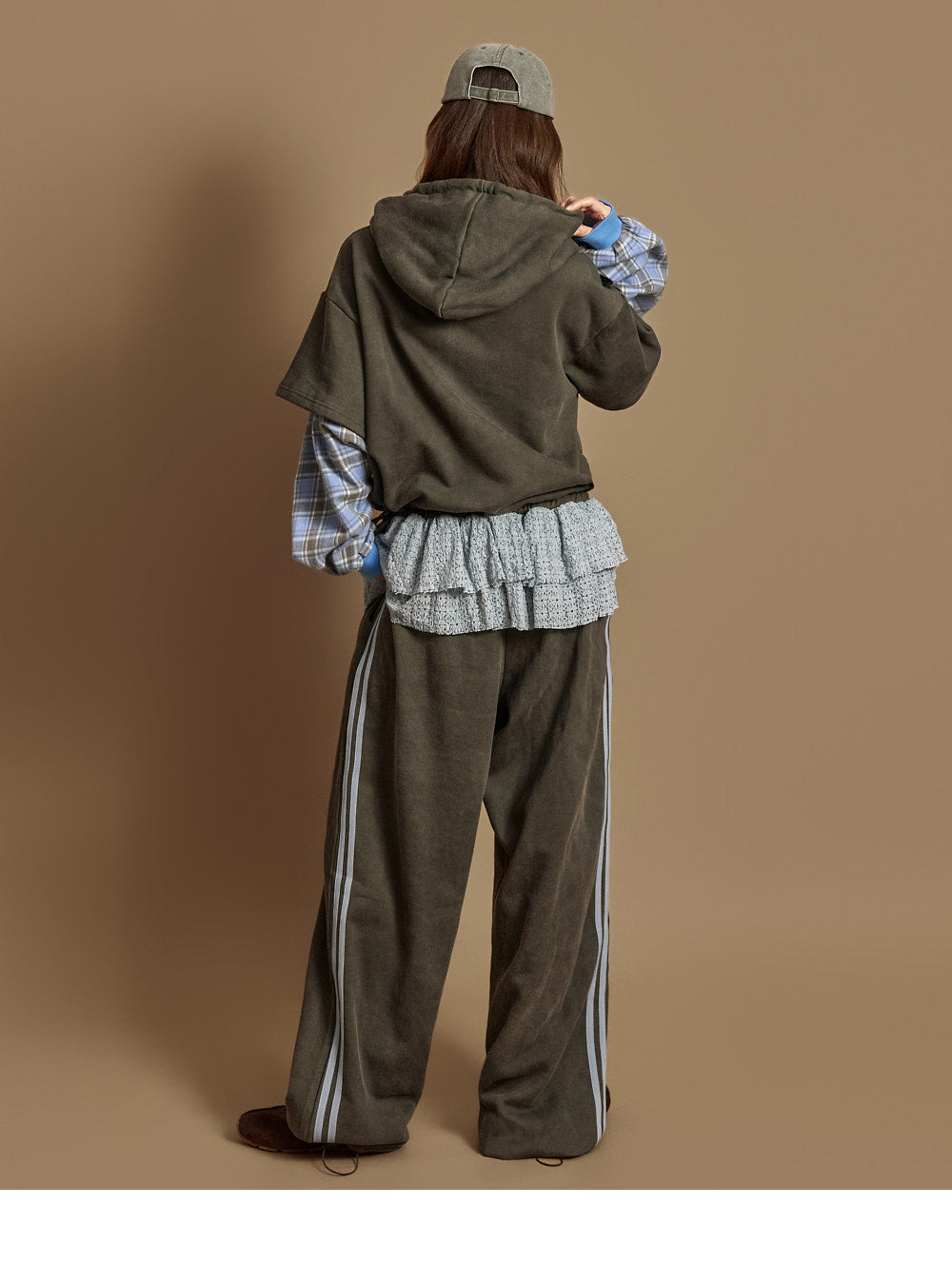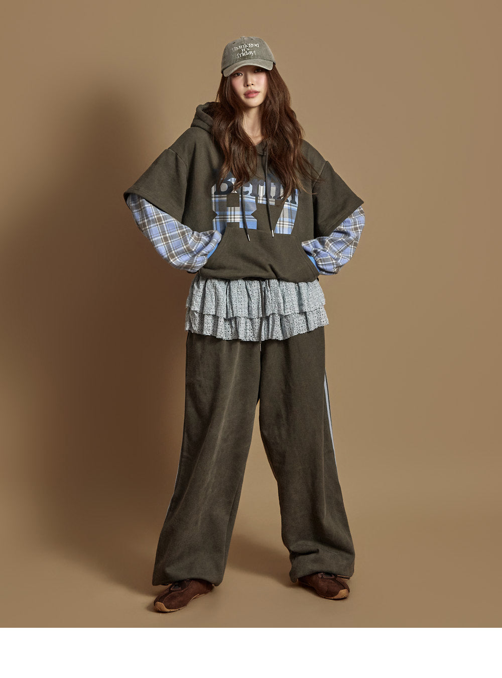 The pants have a wide silhouette, with a comfortable waistband and drawstring,