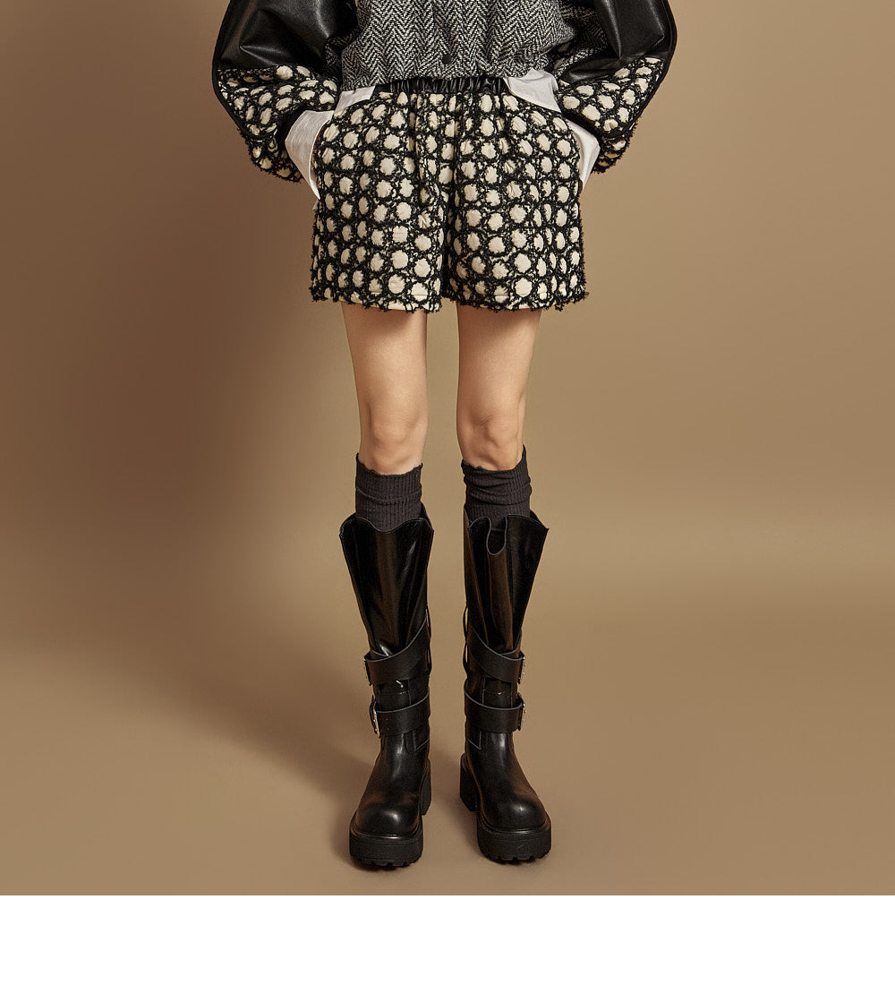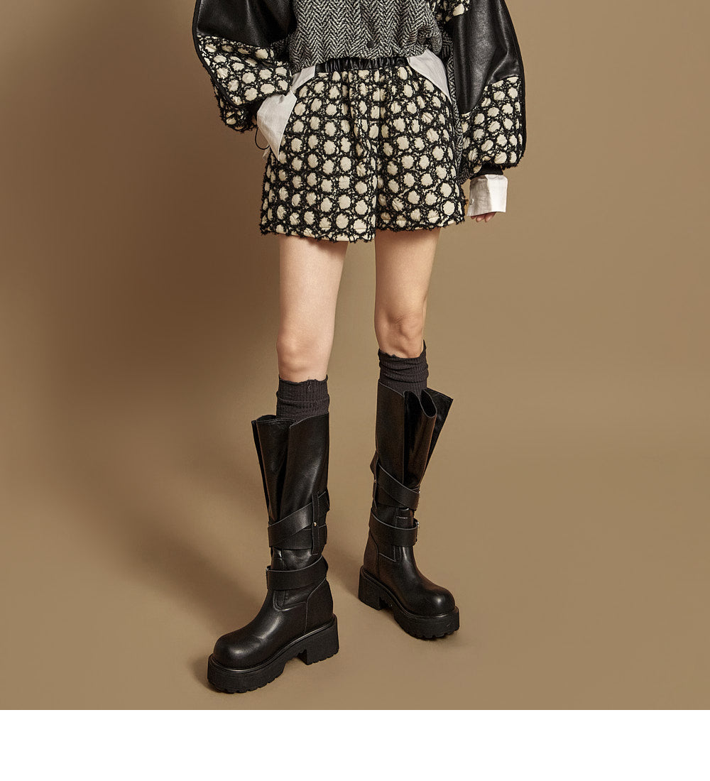 The pants feature an embossed leather texture,
