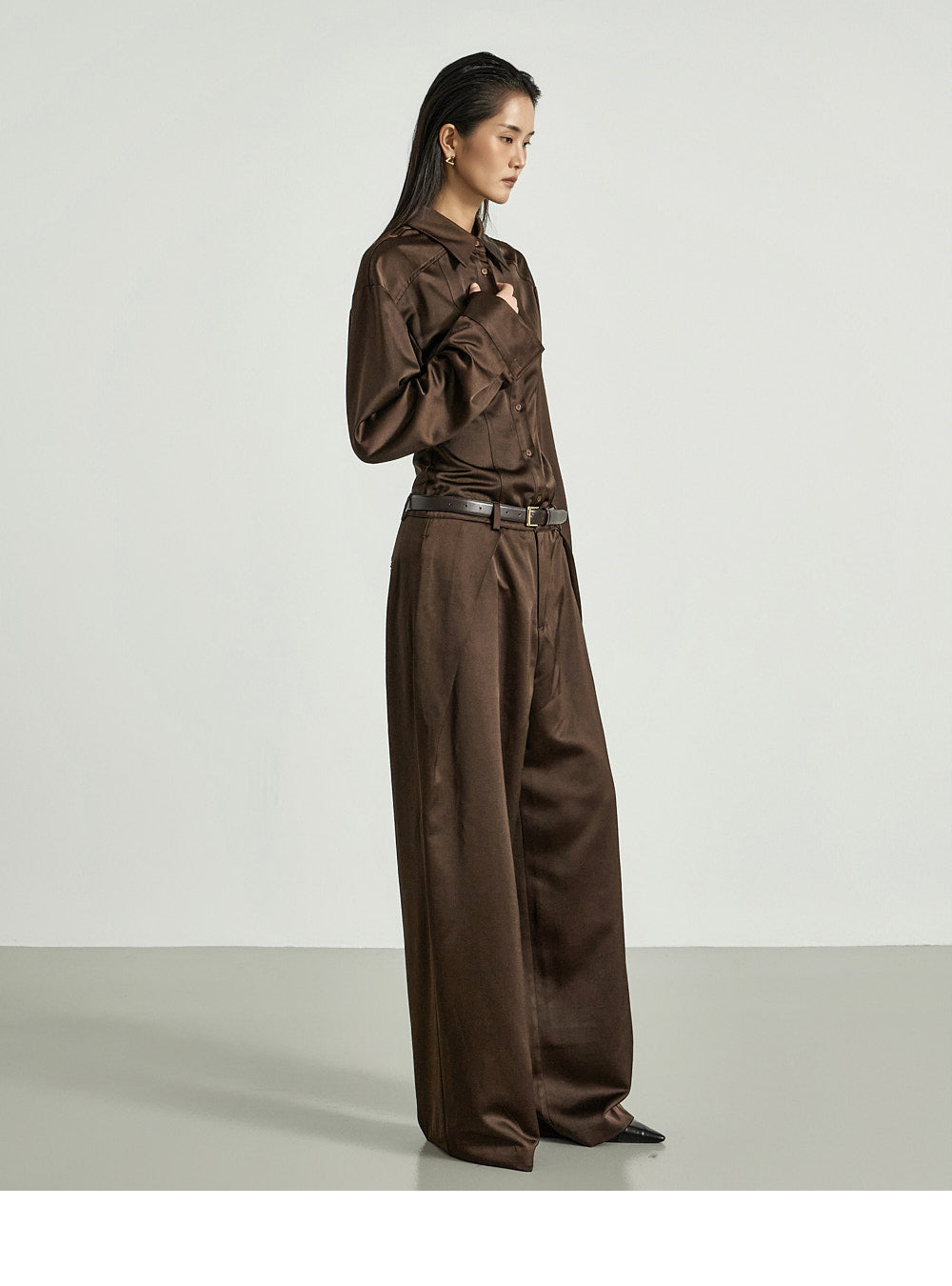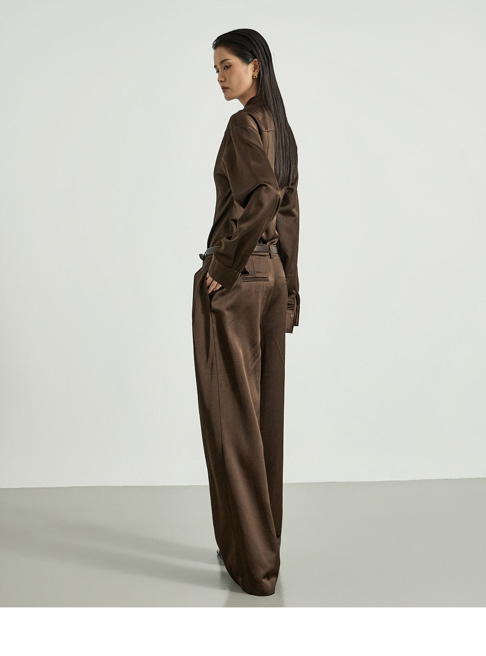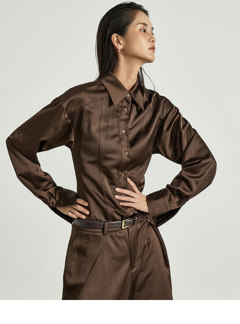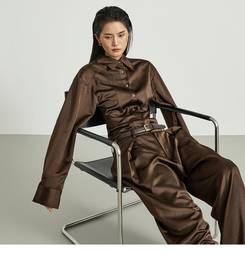 Model is 173cm and wearing a size ONE shirt and size S slacks. Dark Brown.