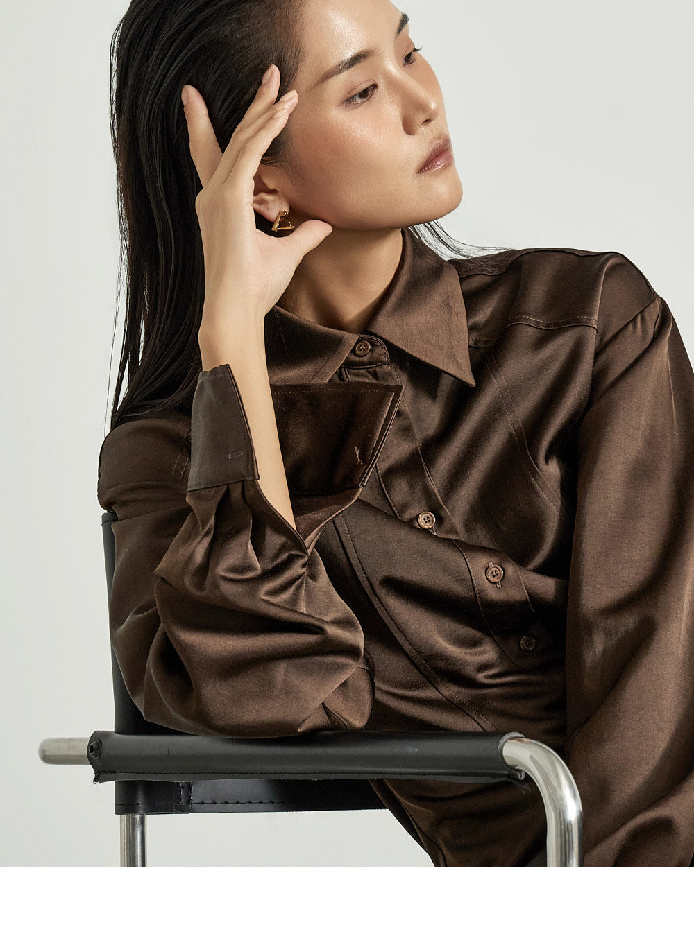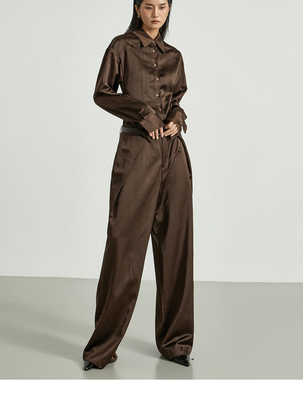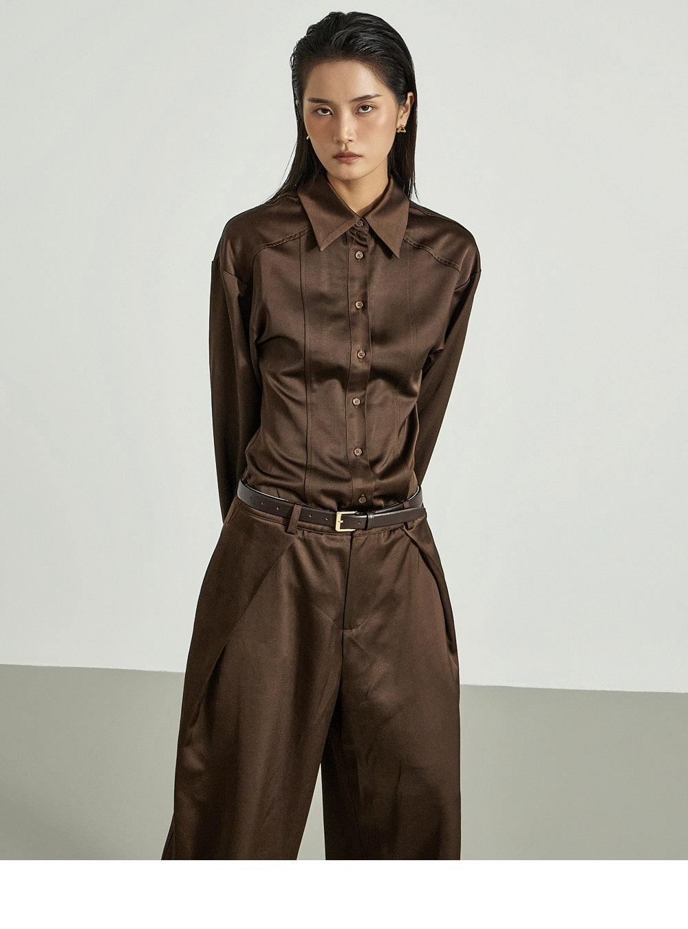 Model is 173cm and wearing a size ONE shirt and size S slacks. Dark Brown.