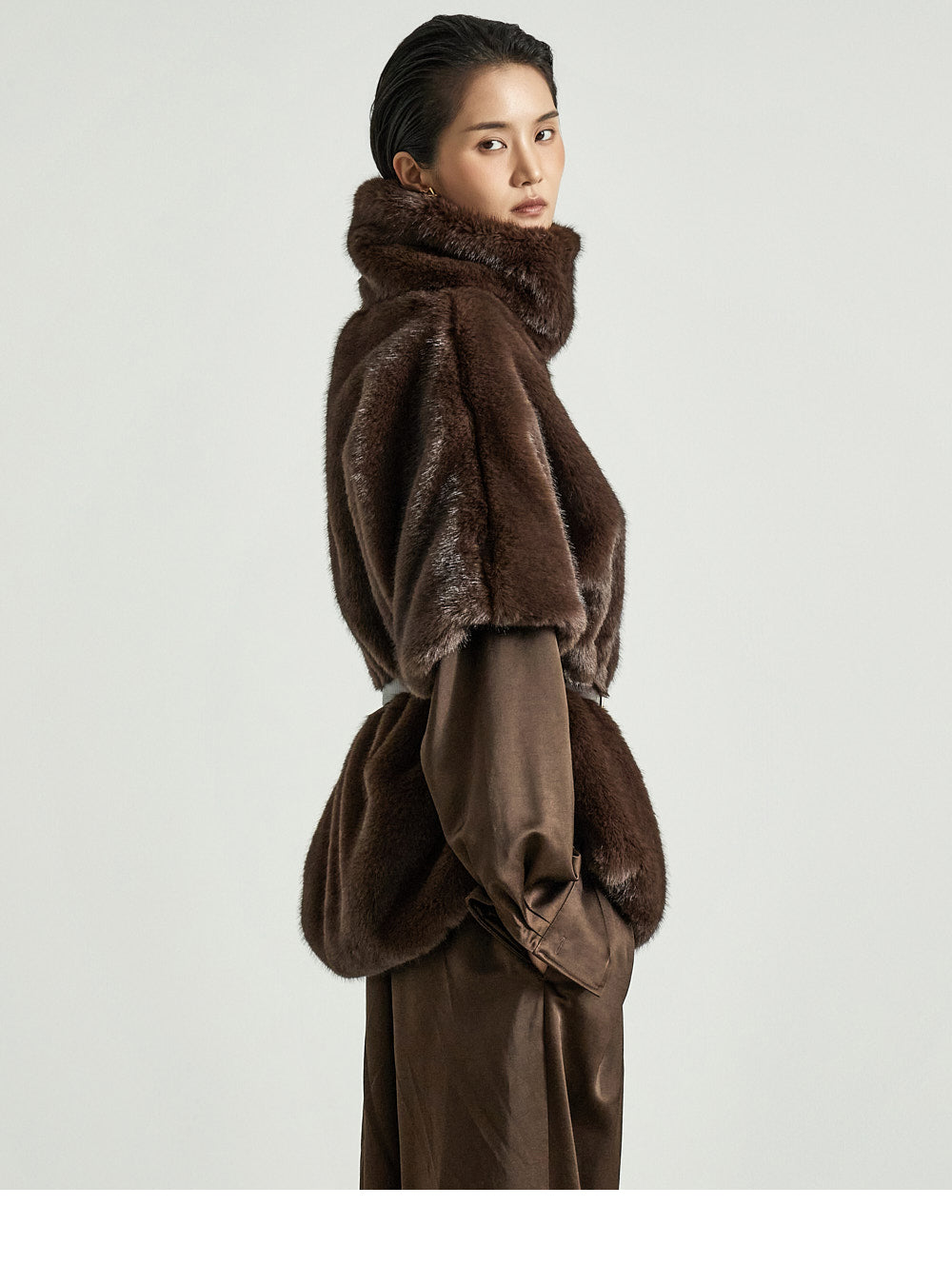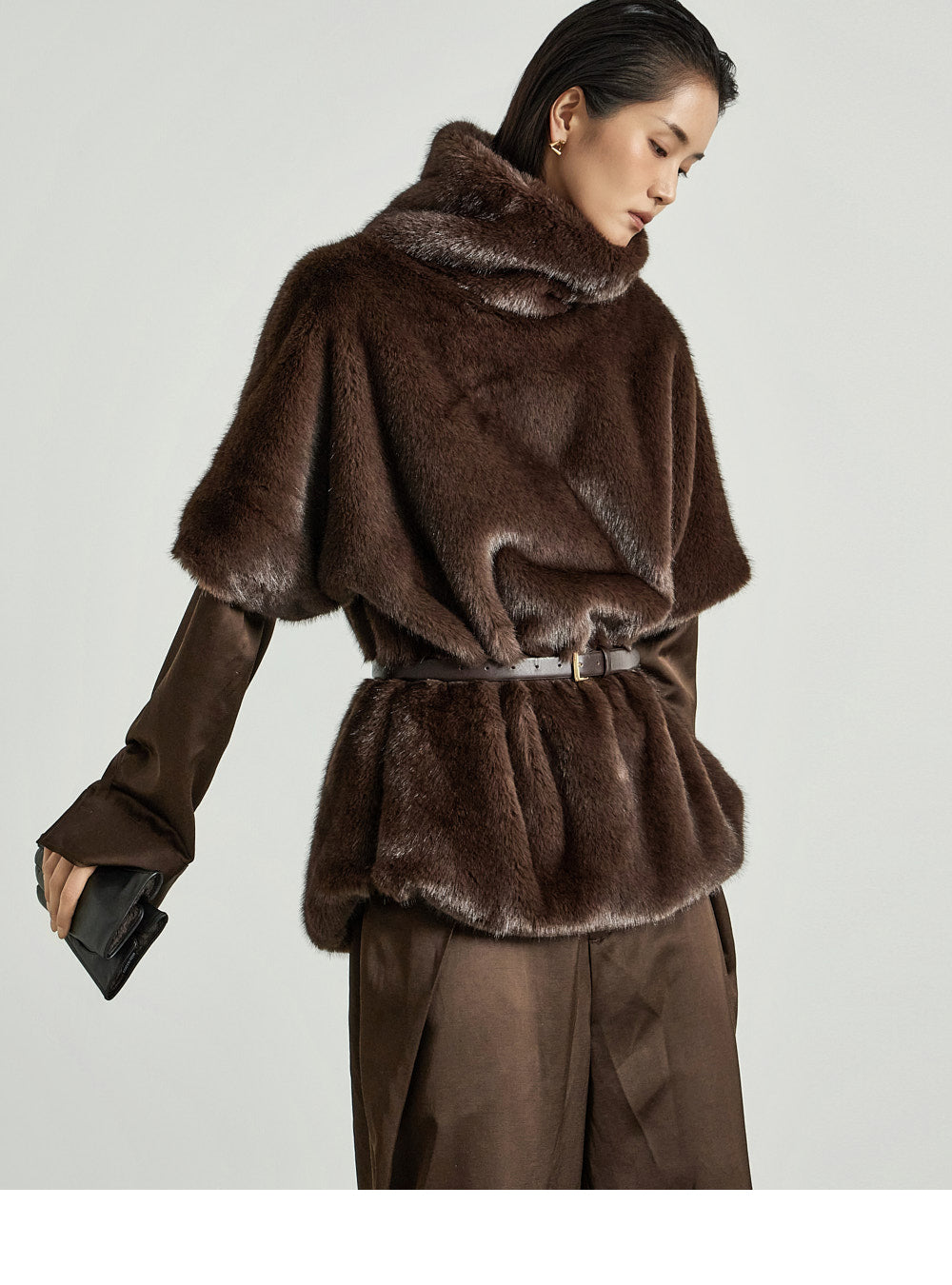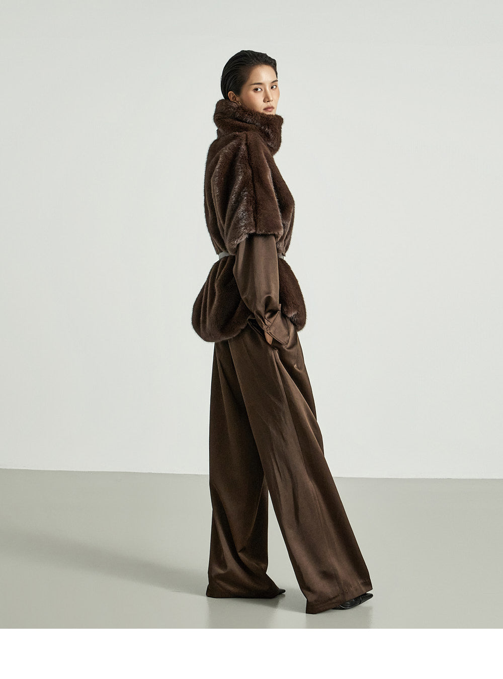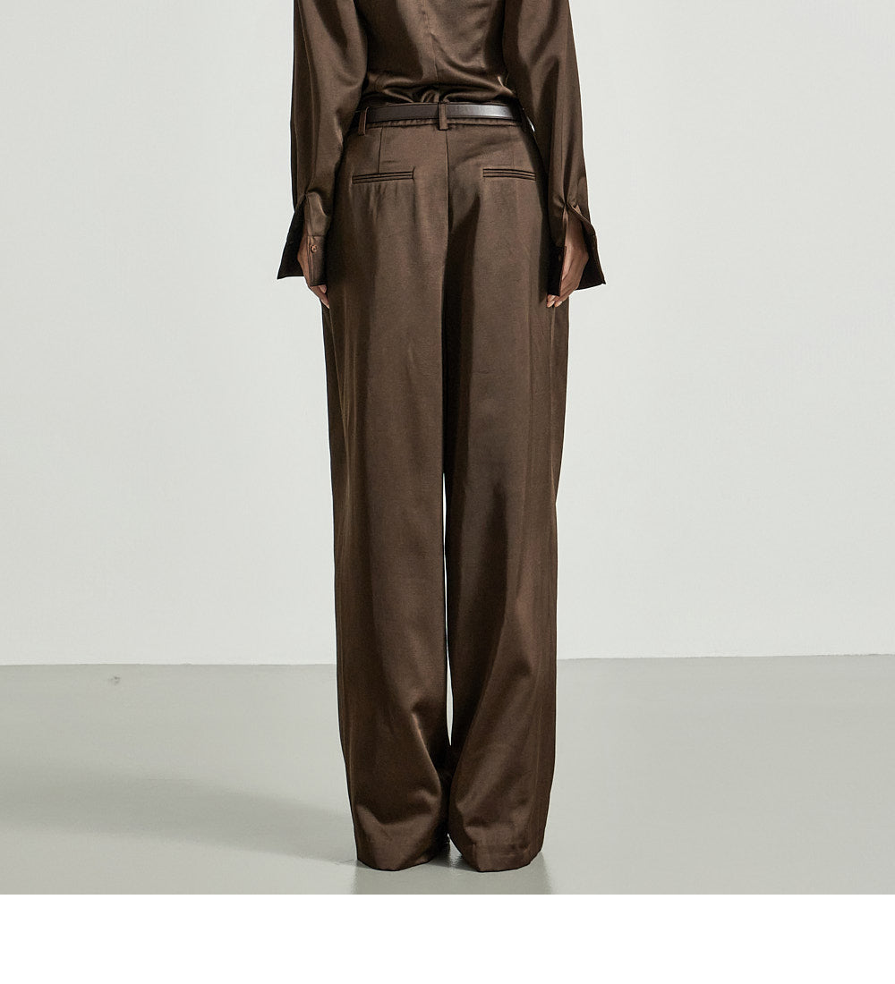 Model is 173cm and wearing a size ONE shirt and size S slacks. Dark Brown.