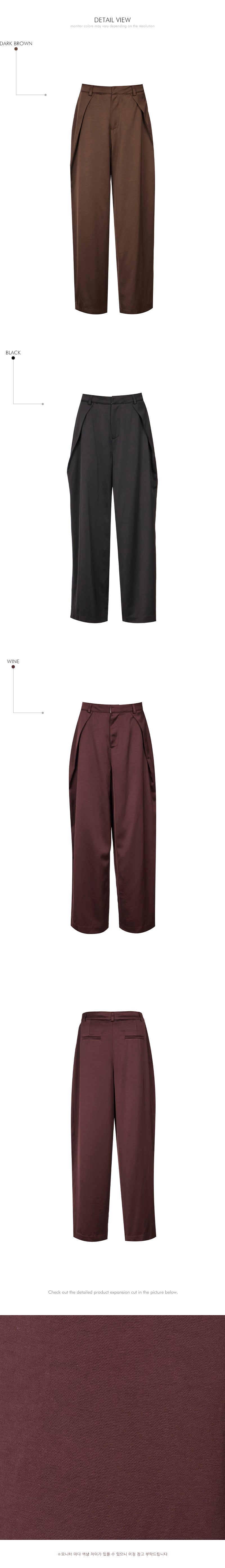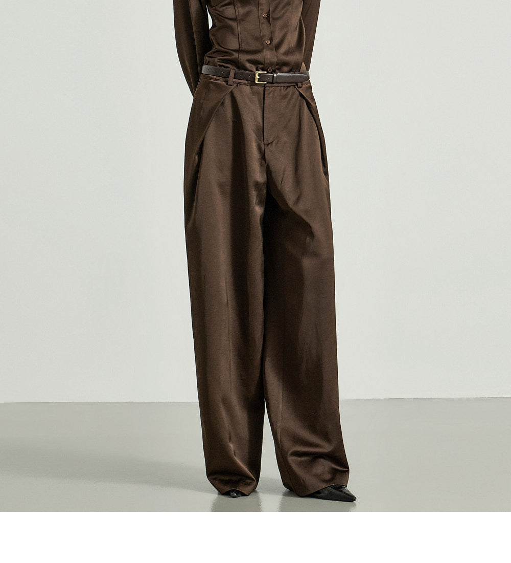 The slacks feature a wide fit and pin-tuck detailing at the hips, creating a unique silhouette.