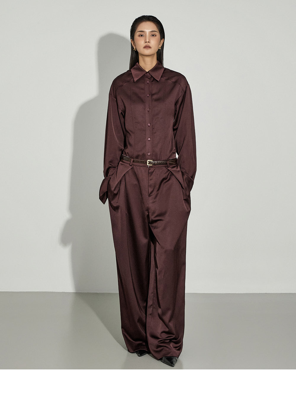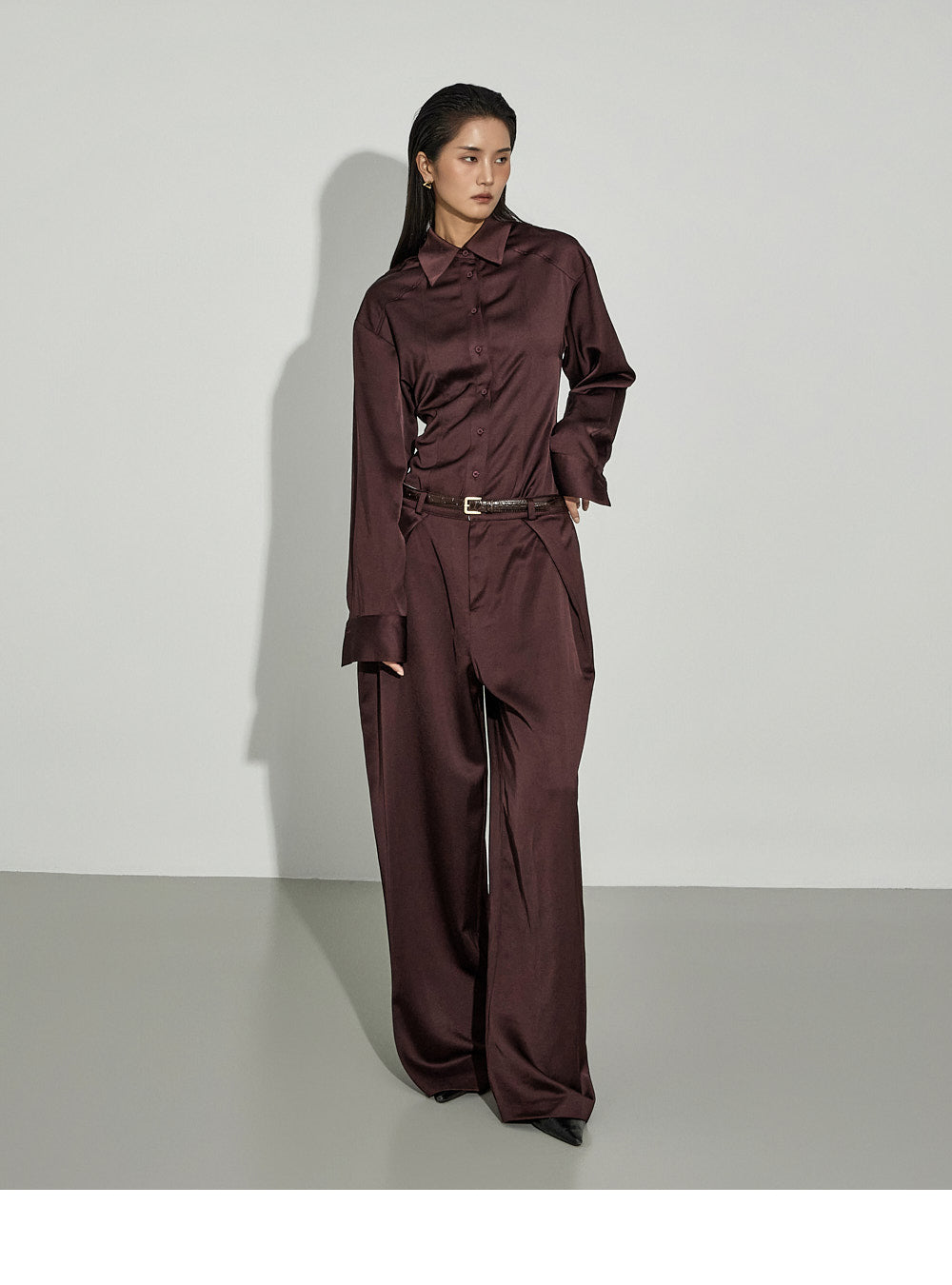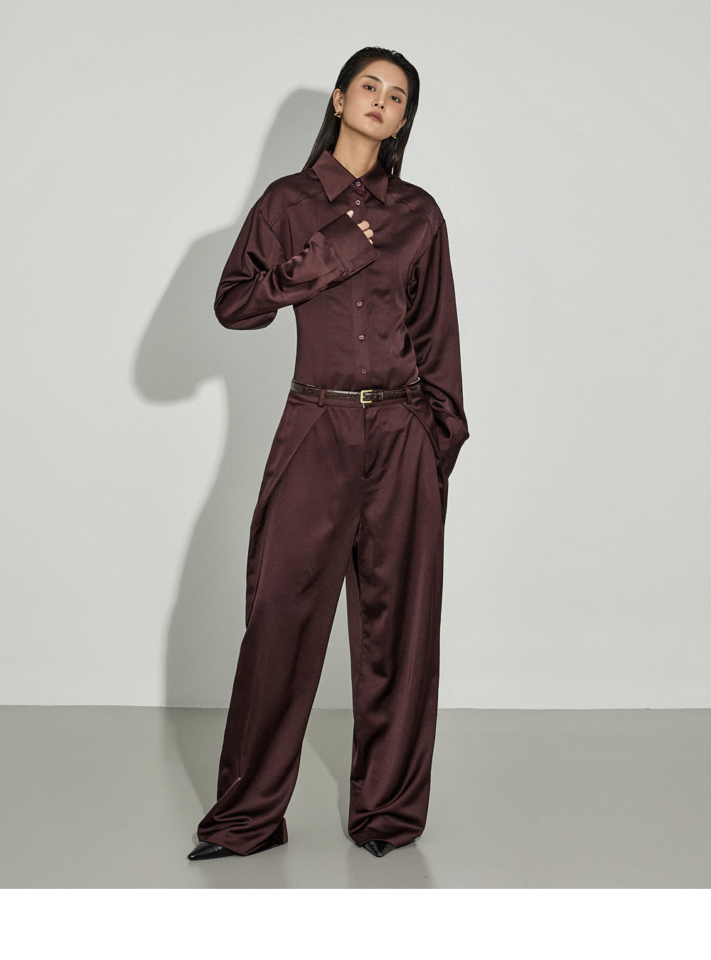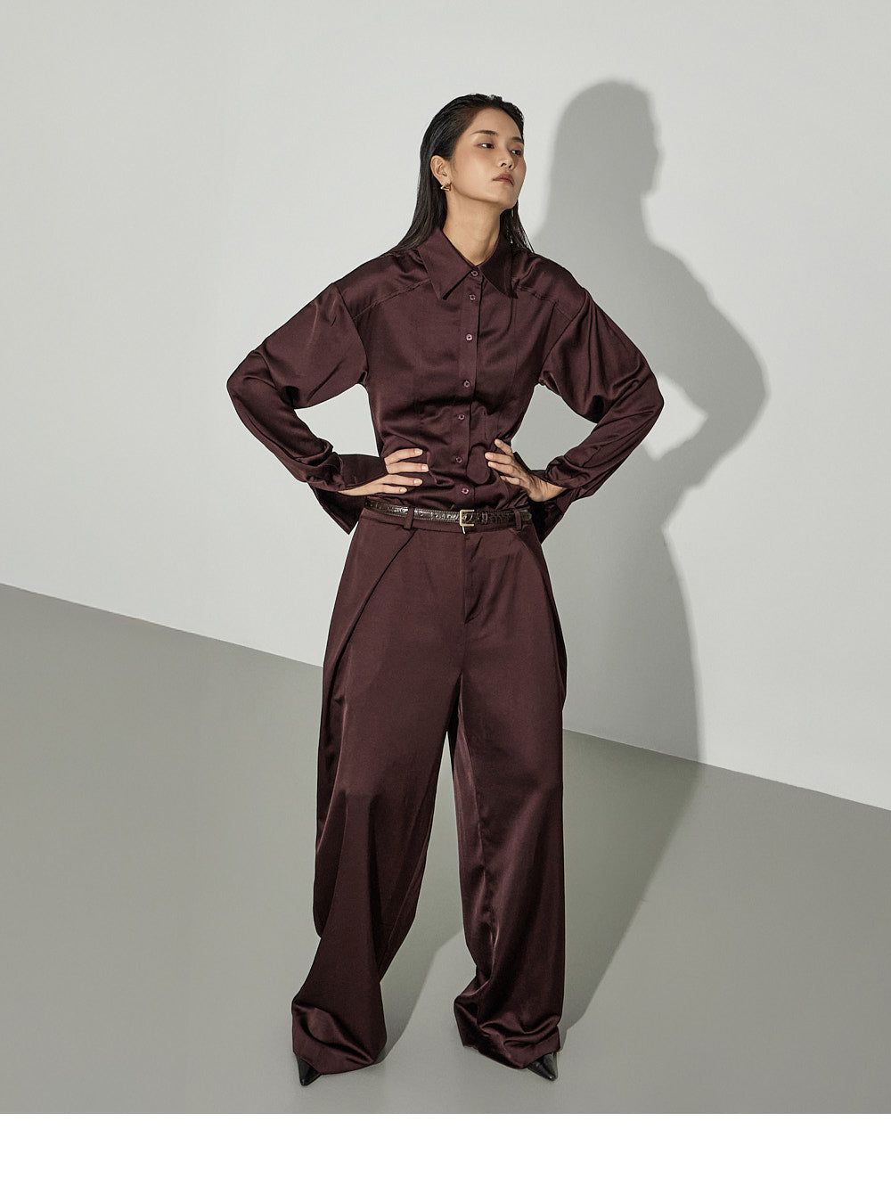 This sophisticated satin set-up exudes sophistication.