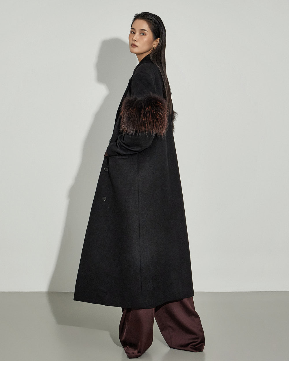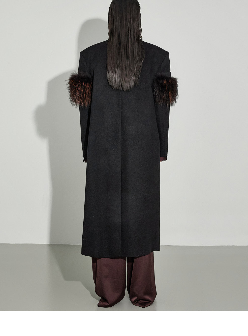 The slacks feature a wide fit and pin-tuck detailing at the hips,