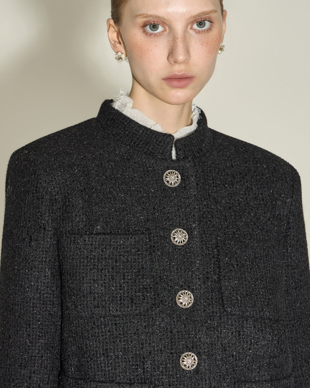 The jacket has a short, fitted length and a Chinese collar,