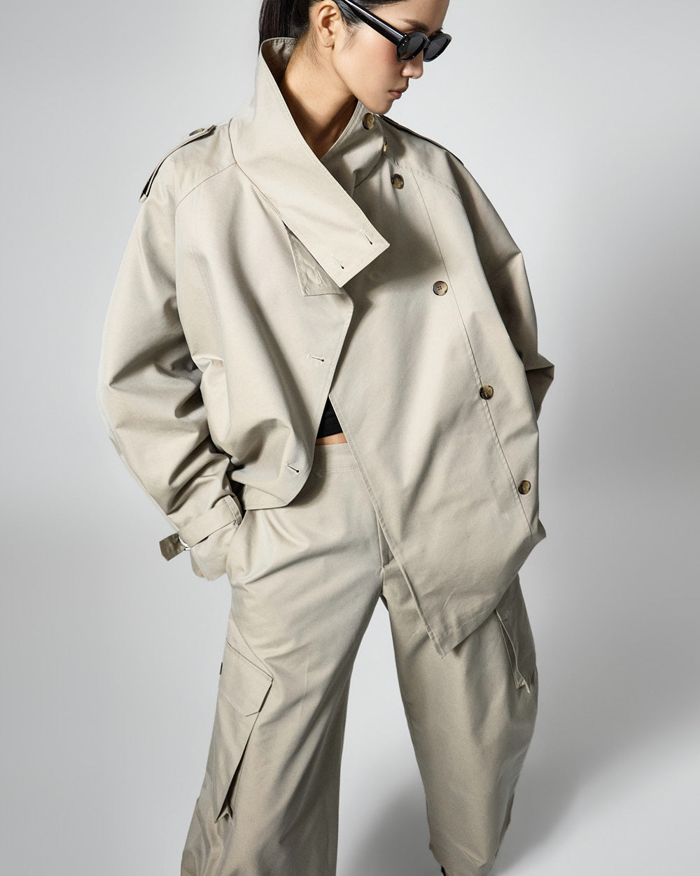 The jacket features a high neck and a loose, boxy fit,