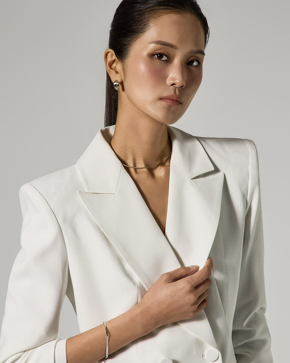 The jacket features four double-button details for a classic touch,