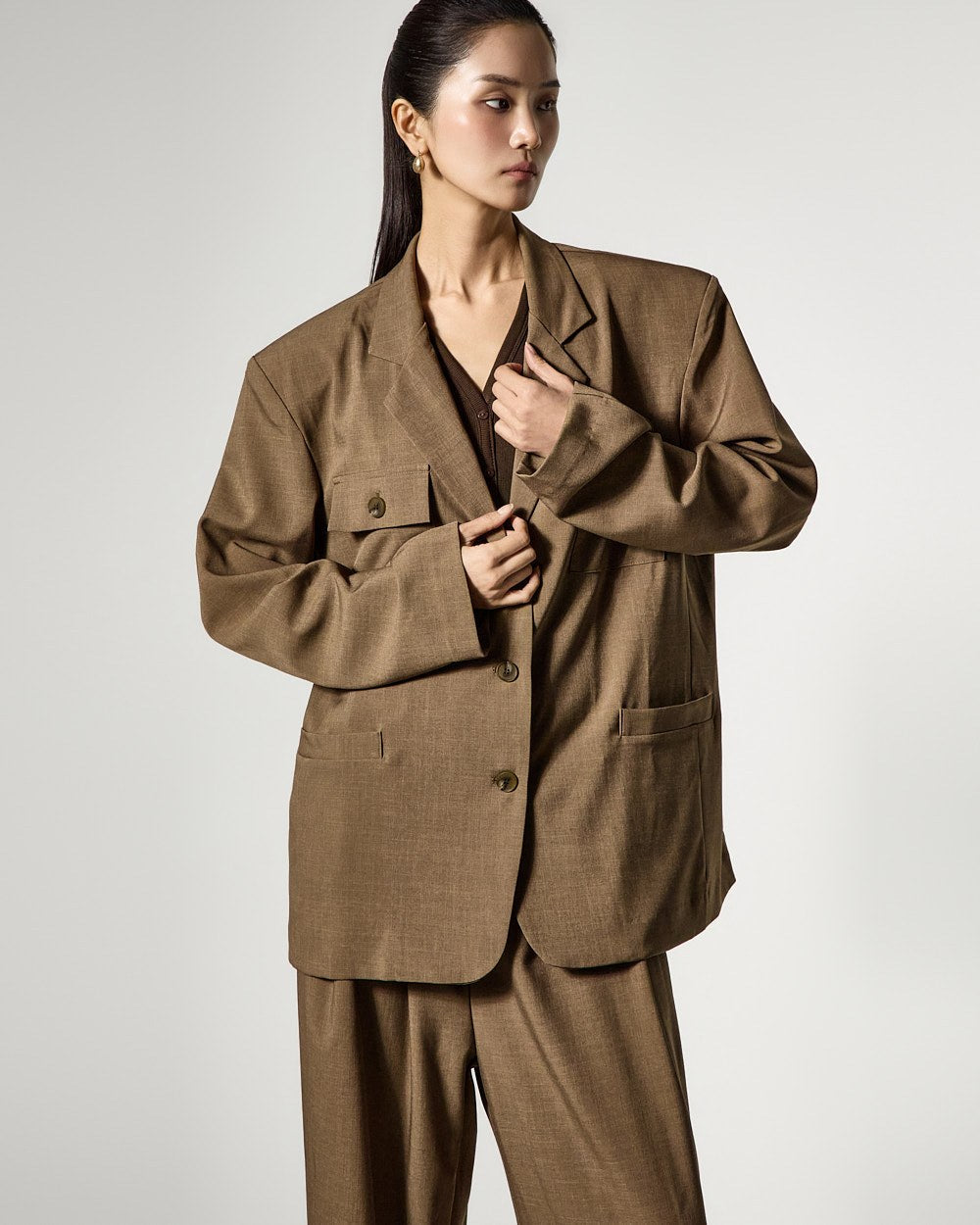 这是一款具有现代气息的夹克和裤子套装。