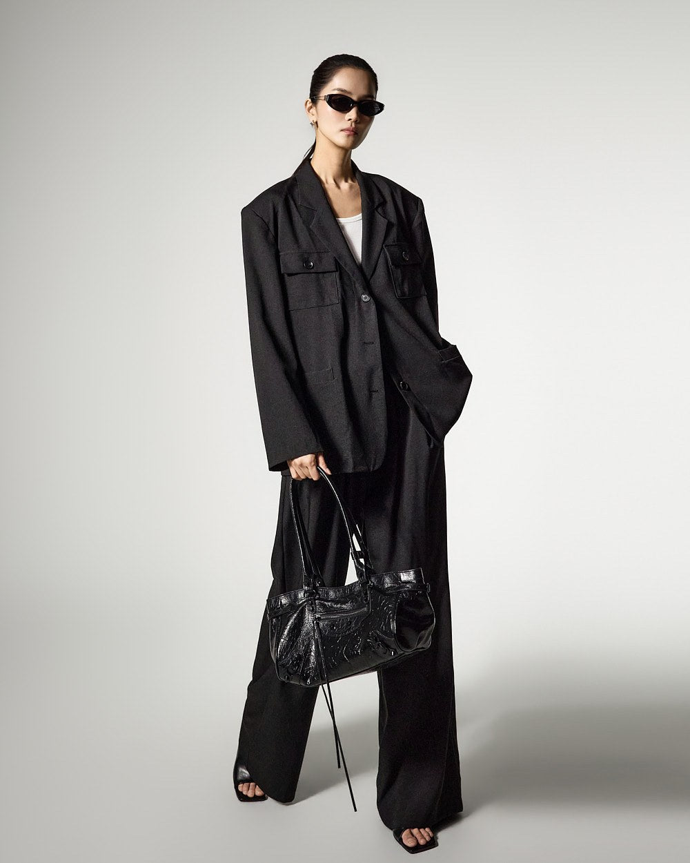 裤子采用宽松廓形,自然垂坠,