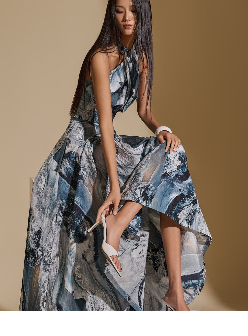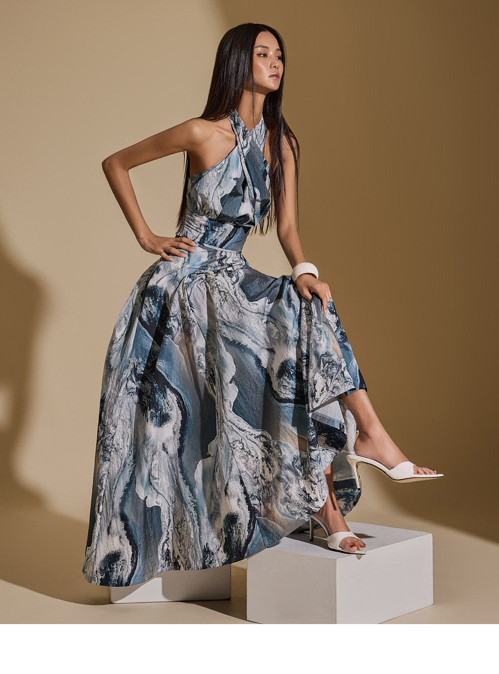 裙子背面有拉链,采用喇叭形设计,