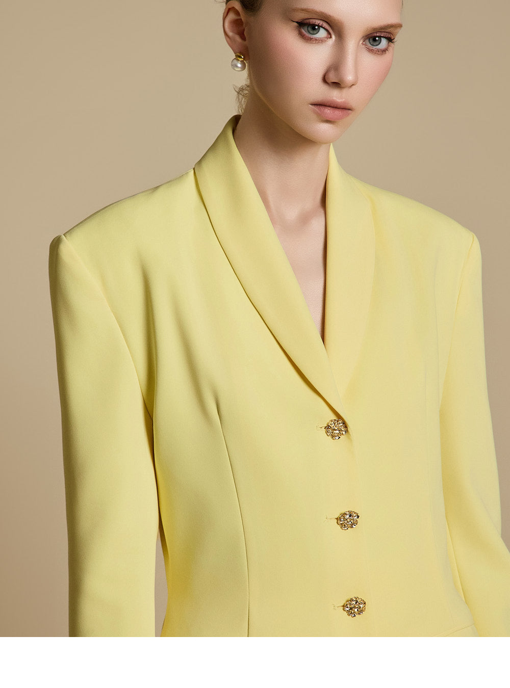模特身高 174 厘米,穿着 LEMON 的 ONE 尺寸夹克和 S 尺寸裙子。