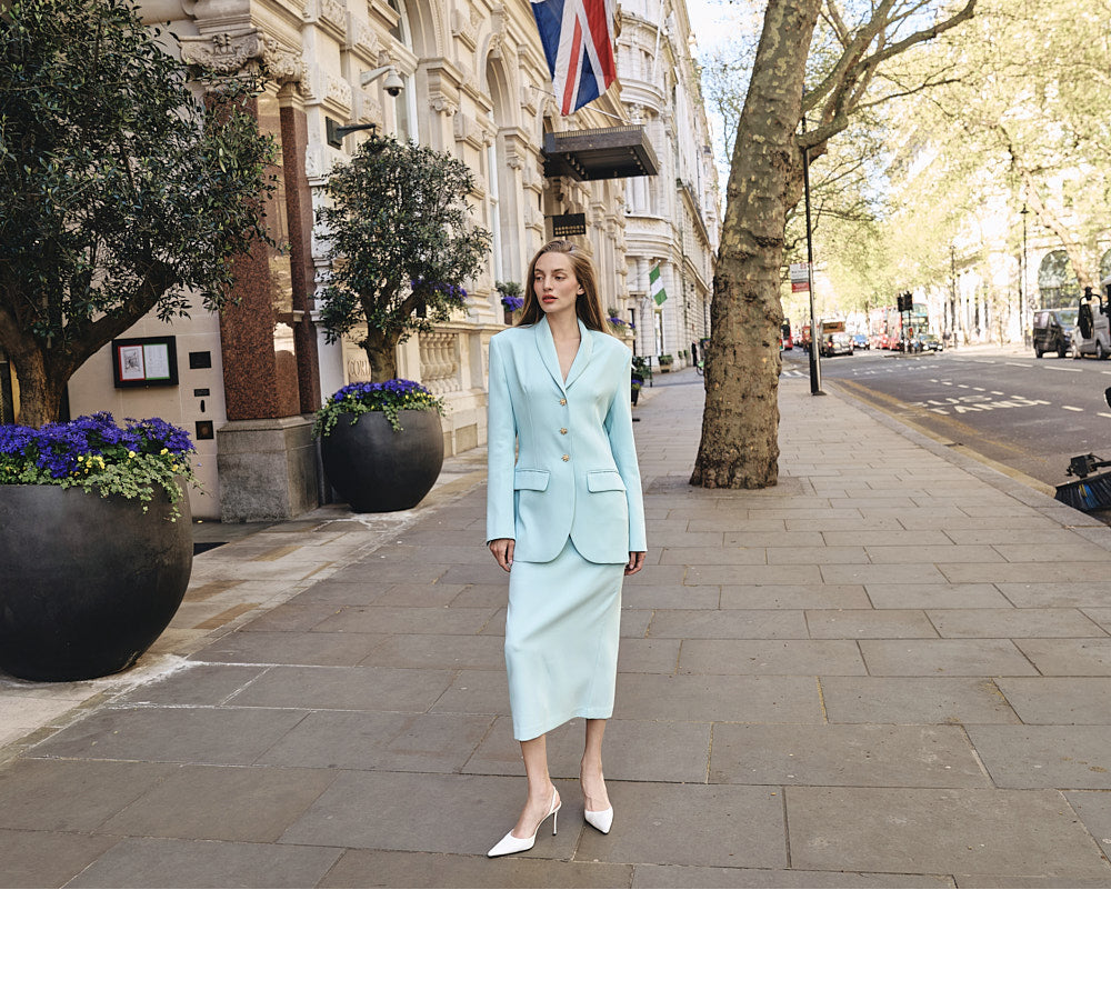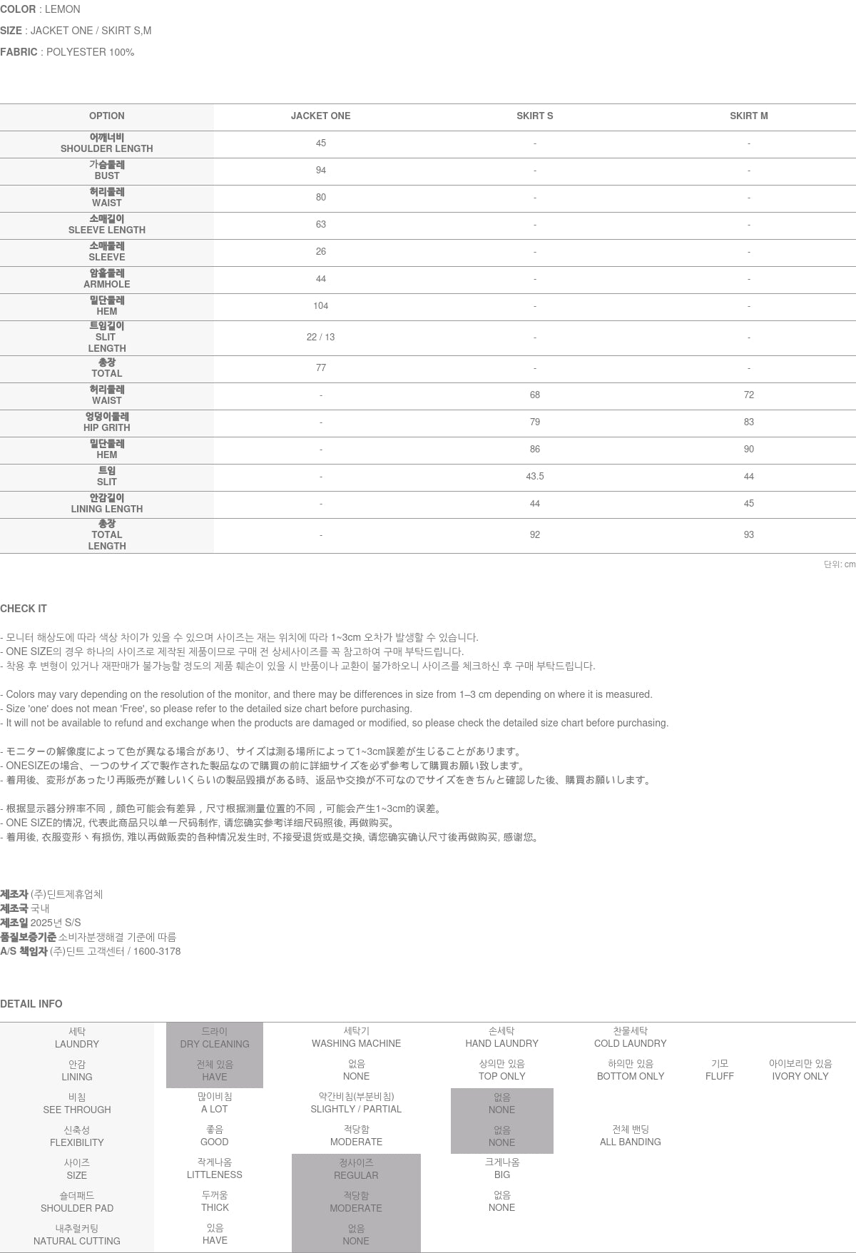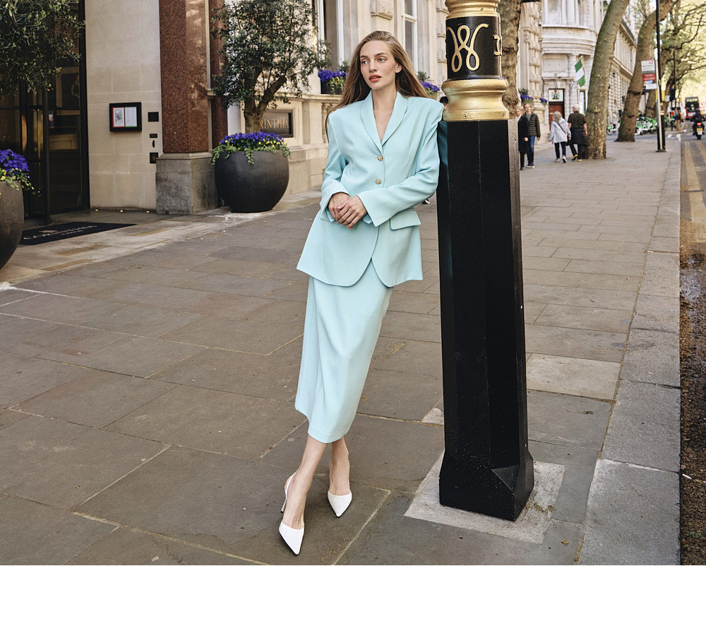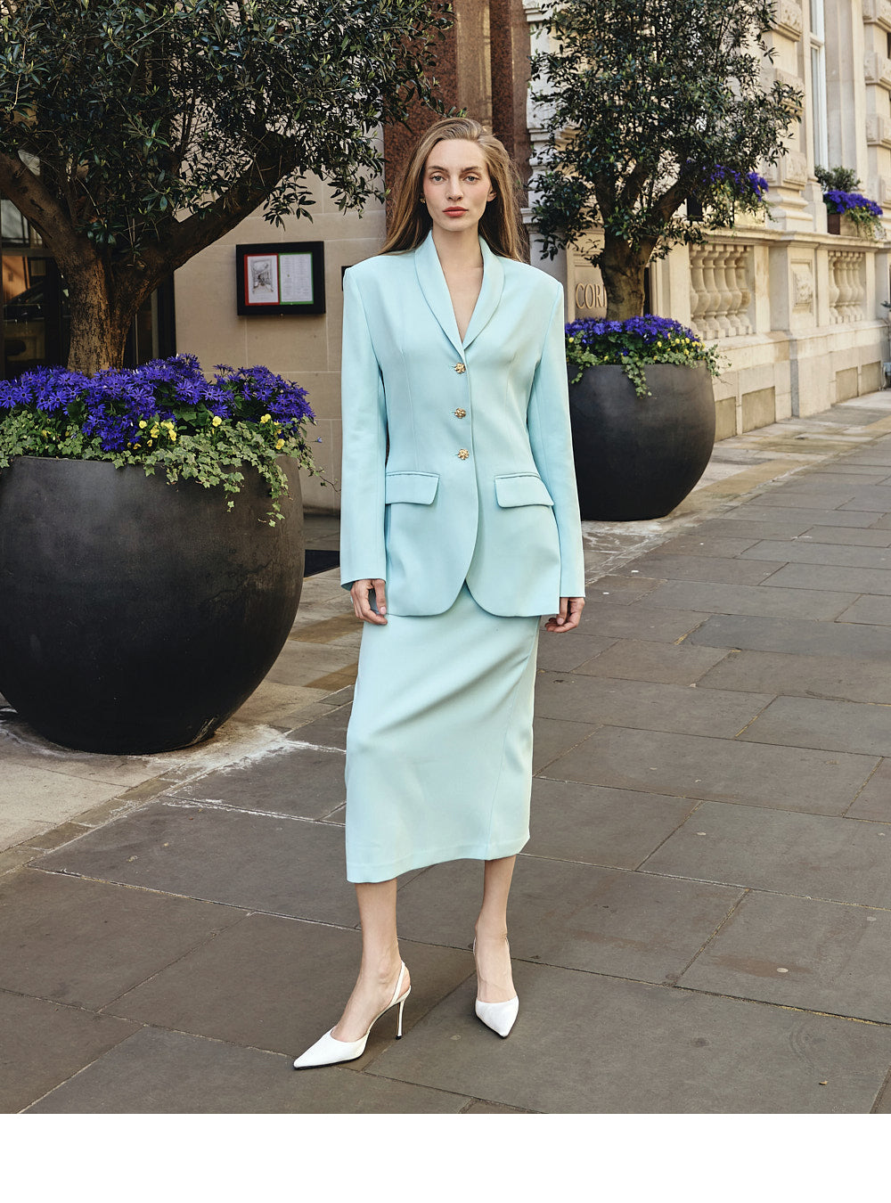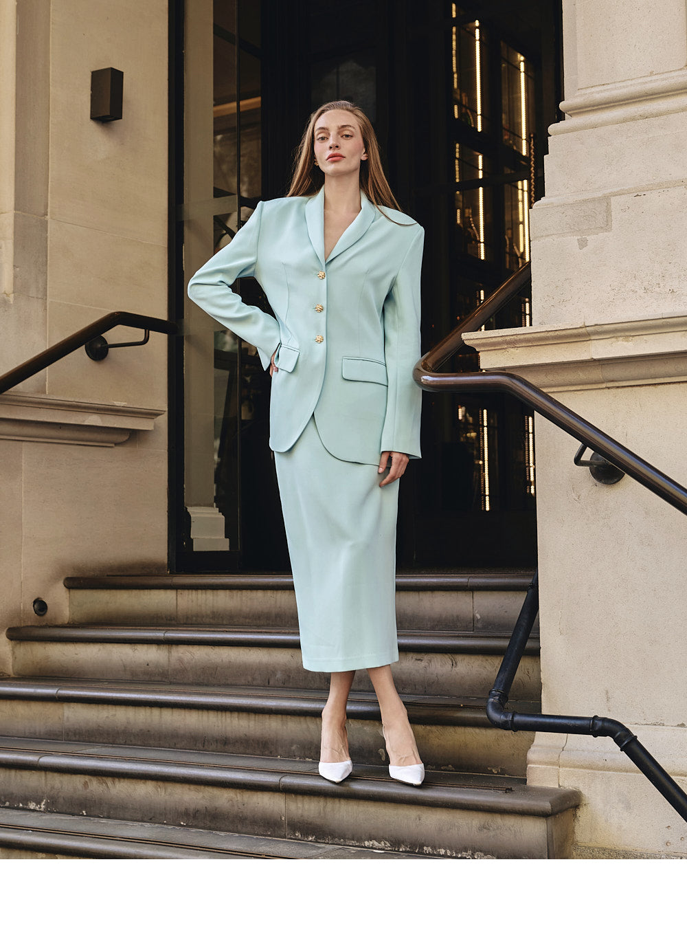 模特身高 174 厘米,穿着SKY MINT的 ONE 尺寸夹克和 S 尺寸裙子。