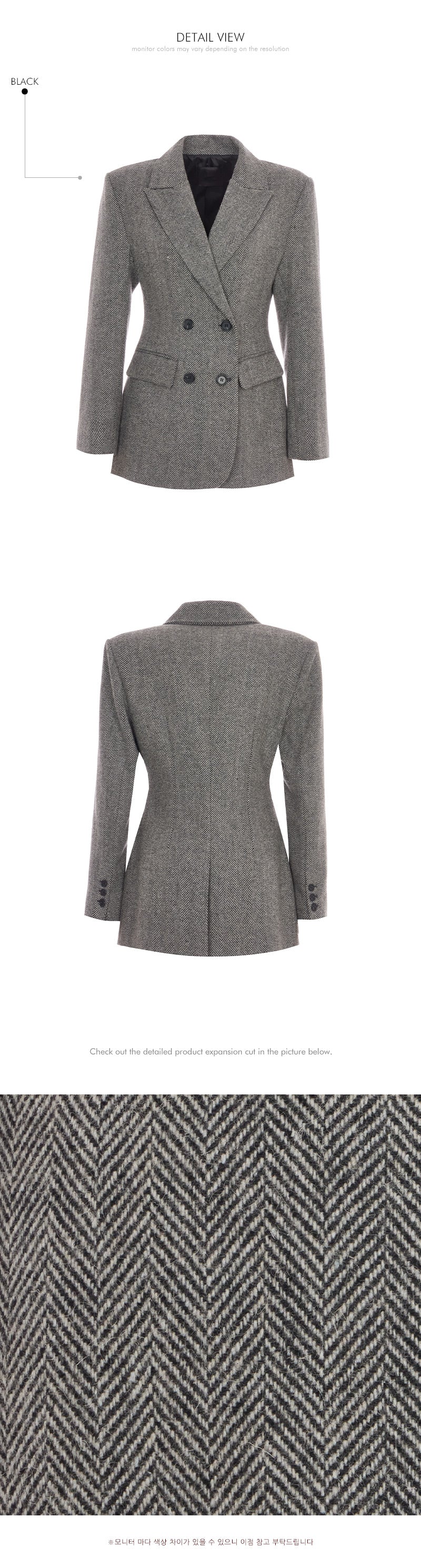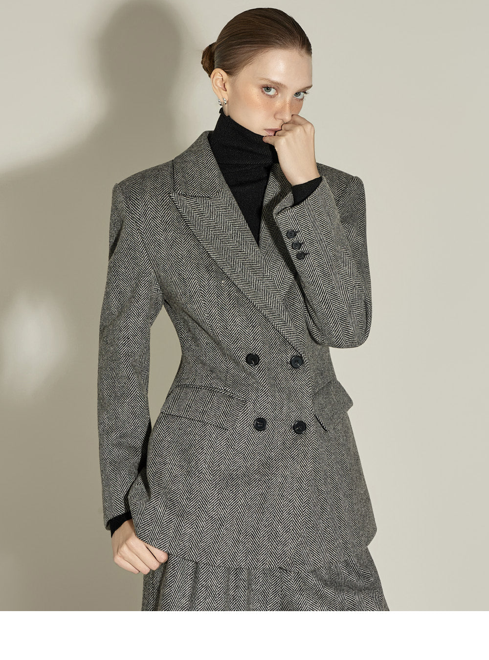 The jacket features a tailored collar and slim-fit silhouette with a defined waistline,